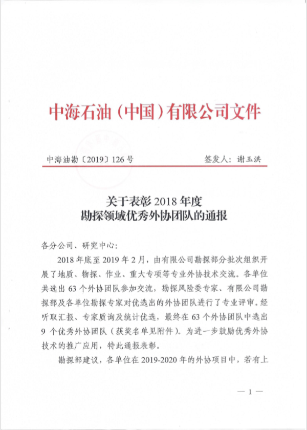 2018年底至2019年2月,中海石油(中国)有限公司勘探部分批次组织地质、物探、作业、重大专项等专业外协技术交流,各单位选出63个外协团队参与交流,经过勘探风险委专家、公司勘探专家严格评审,从63个外协团队中评选出了9个优秀外协研究团队。