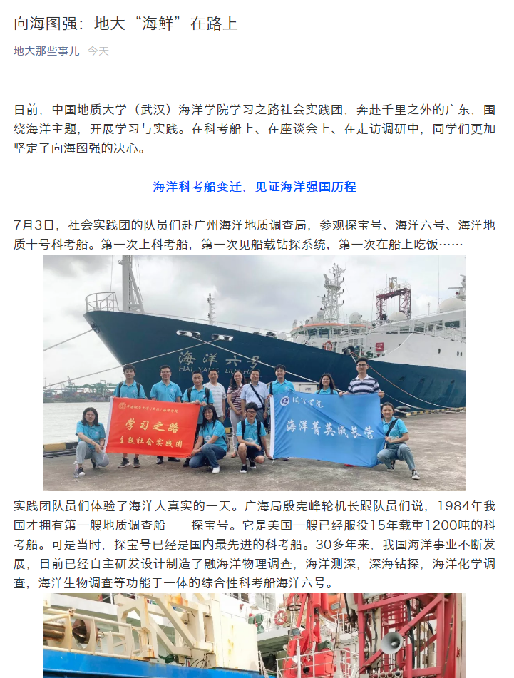 报道从“海洋科考船变迁,见证海洋强国历程”、“地大校友如同深海,默默奉献波澜不惊”、 “练就过硬专业本领,树立谋海济国之志”、“走进港珠澳大桥,找到奋斗的动力”四个专题部分对Av影片 “学海洋强国思想,践向海图强之路”的暑期社会实践活动进行详细的报道。