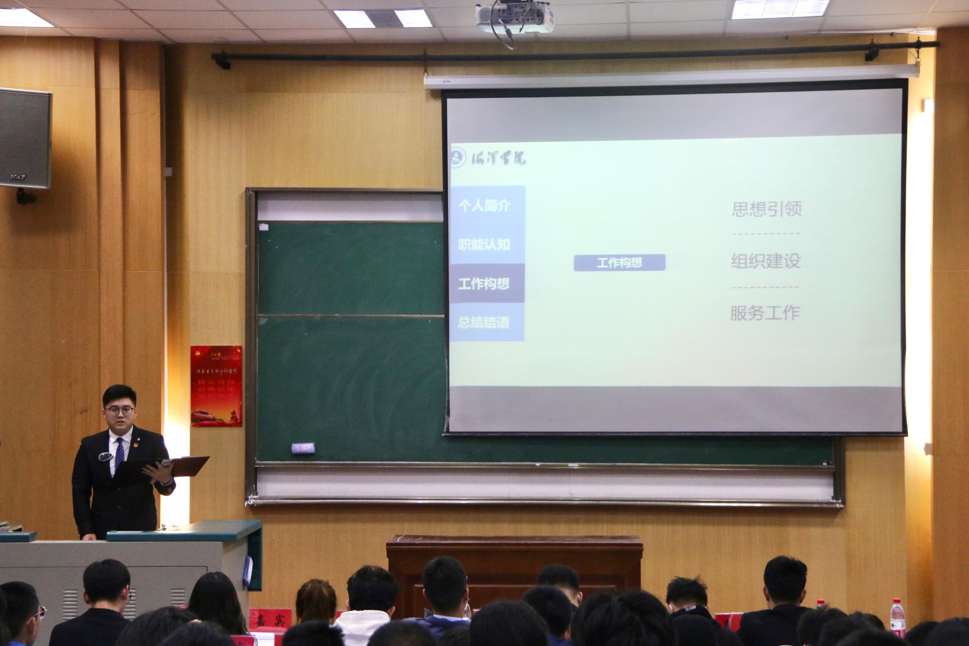 学委会组成方案的说明》、《大会资格审查报告》。八位候选人按照抽签顺序依次发表演讲,阐述了自己的竞选意向和工作理念,积极回应现场学生代表提问,同与会代表充分沟通自身工作规划。