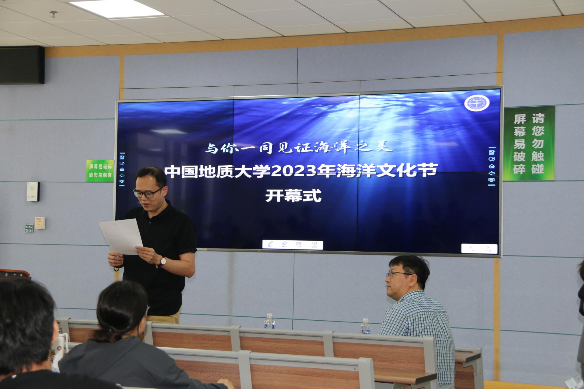 副院长宫勋介绍开幕式讲座嘉宾。他表示,希望通过“科海扬帆,筑梦深蓝”海洋文化节系列科普讲座的开展,不断拉近师生与蔚蓝海洋的距离,共同提升我们保护海洋的意识。