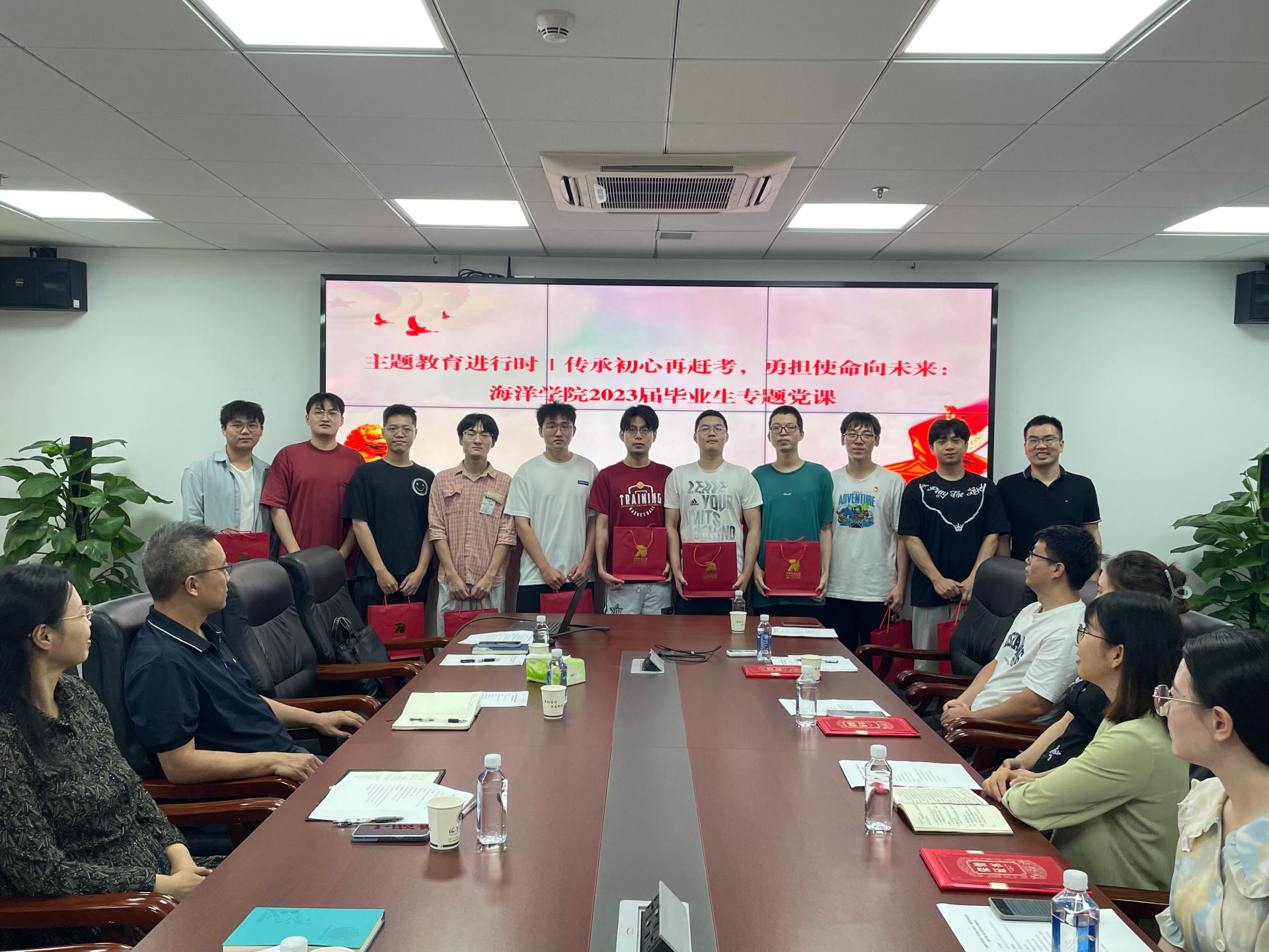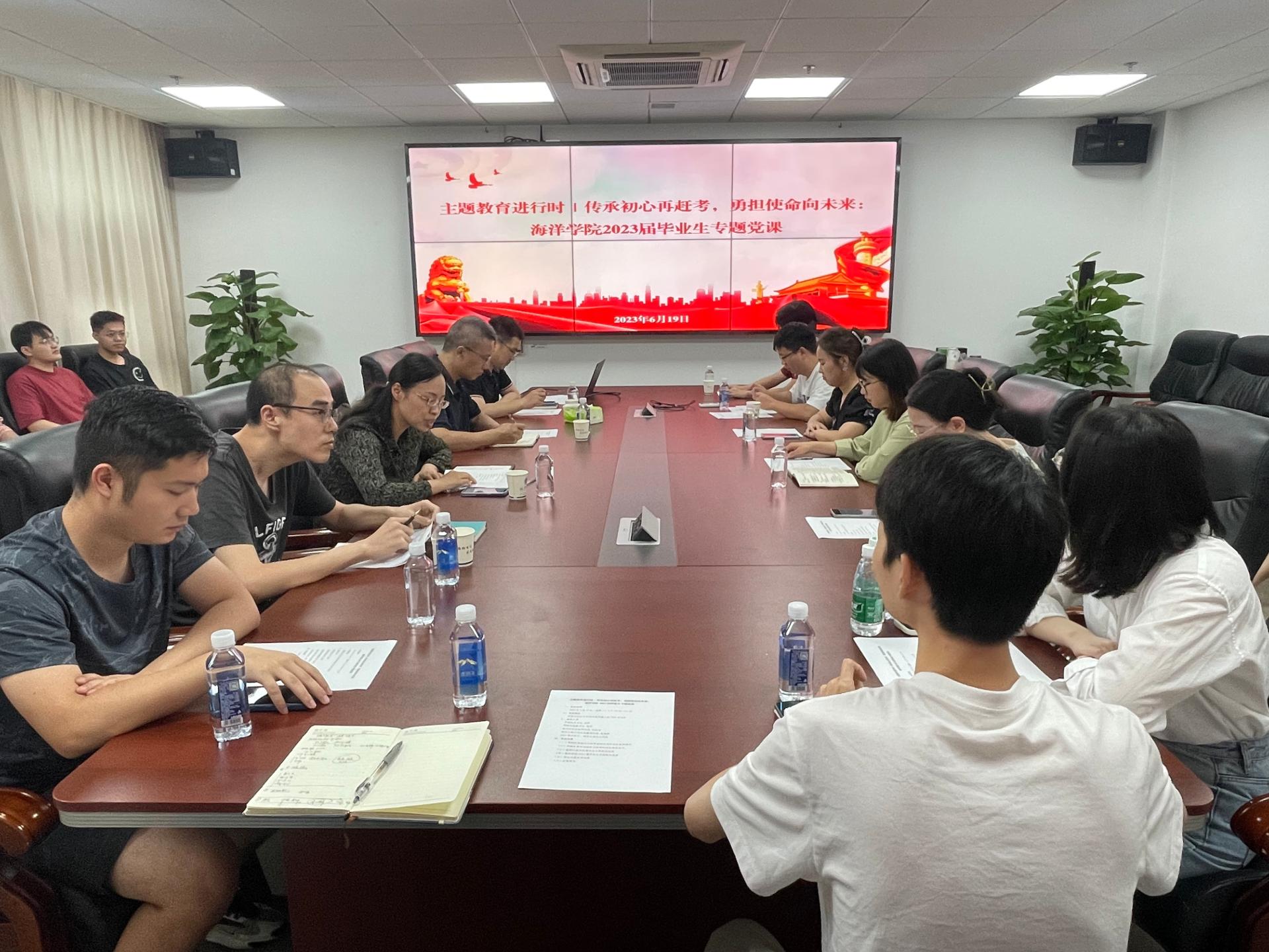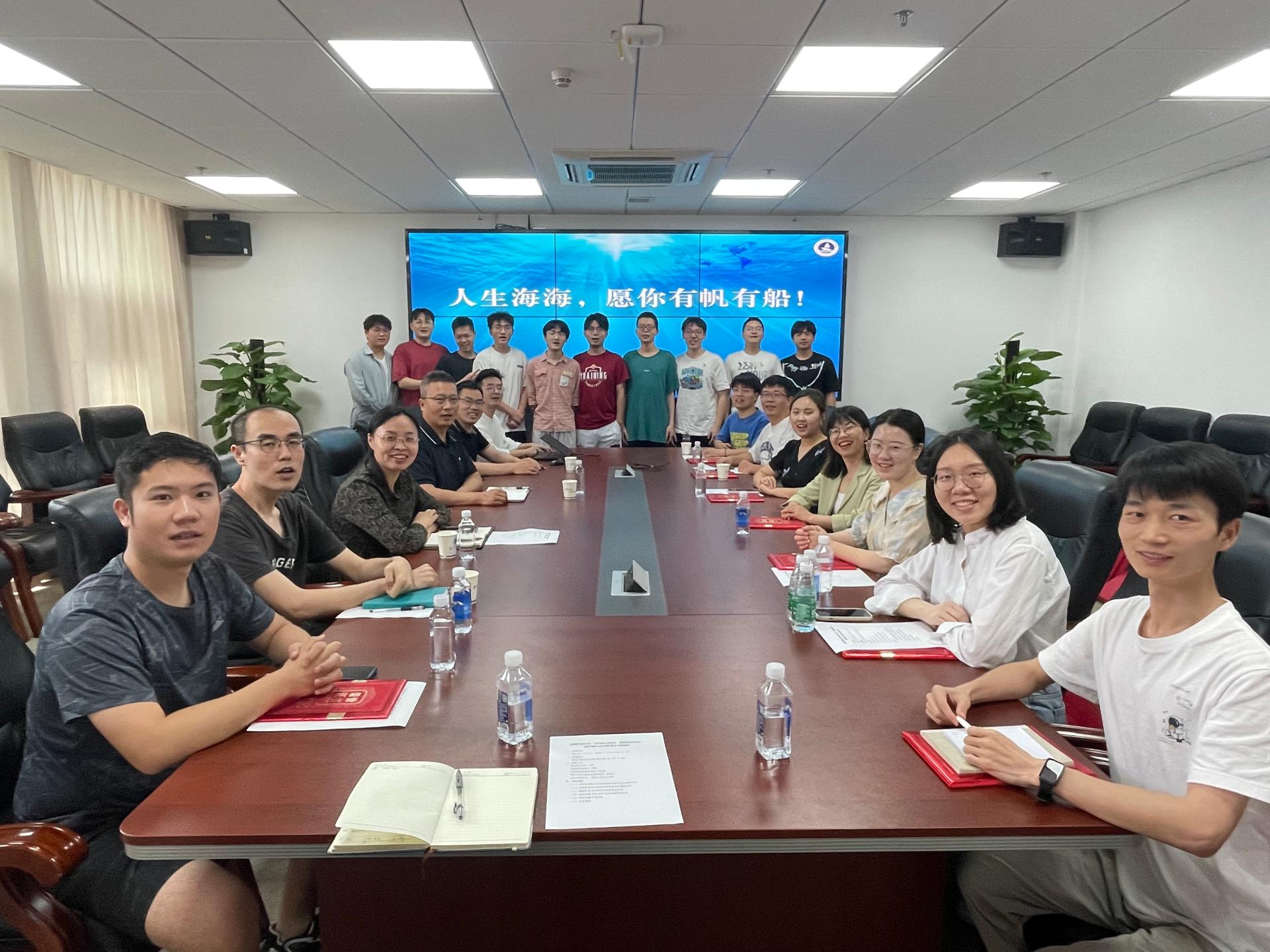 党委书记成军、院党委副书记钟苹、海洋科学系教师代表刘恩涛、海洋工程与技术系教师代表姜逢源、毕业生辅导员陈杨与学院本硕博共计20名毕业生围坐一起,交流收获,展望未来。座谈会由学院党委副书记钟苹主持。