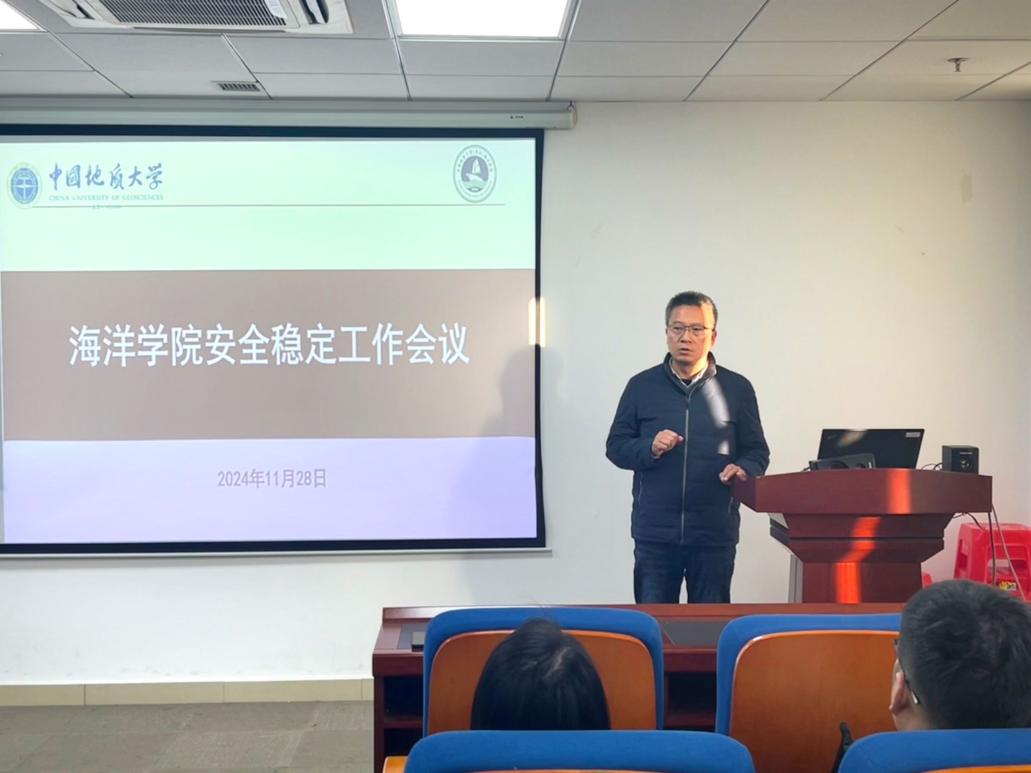 成军做总结发言。他表示,学院一直以来高度重视安全稳定工作,并积极提供各项支持和帮助。他强调,各位老师要做好访谈建档工作,落细落实重点学生谈话、记录等工作,并重点关注校外住宿、就业困难等重点学生群体,防患于未然。最后,希望各位老师能够切实做到关心、陪伴、爱护学生,切实发挥好学生骨干团体作用,及时有效化解矛盾纠纷,共同筑牢学院安全工作底线。