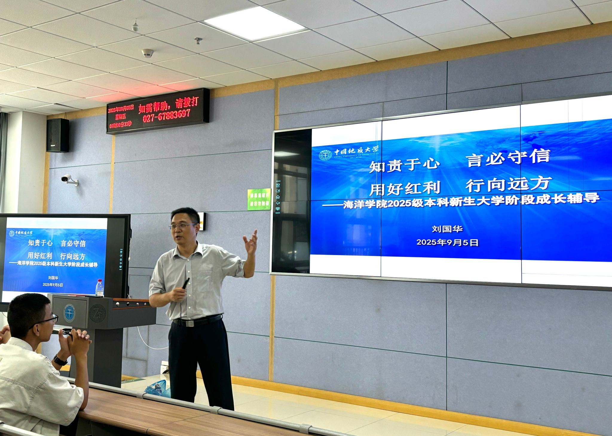 刘国华书记所讲第三模块主题是《深耕致远》,他把《礼记·大学》中“知止而后有定、定而后能静、静而后能安、安而后能虑、虑而后能得”这一名言警句送给大家;他强调了学习成绩之重要性、提升自身综合素质之重要性,大学阶段须学会静心取经和痕迹化经营自我,讲述了学籍、学分、GPA(平均学分绩点)、综合测评、考级考证、竞赛、奖学金和部分优秀学长学姐事例,详细介绍了保研(参加夏令营)、考研、考公考编考资等要求和过程;他叮嘱同学们心有所信、方能行远,事闲勿荒、事繁勿慌,大学期间甚至工作后不要指望任何人在背后推着前行,学会独立思考和给自己提供“情绪价值”,科学用好自己大量碎片化时间,学会在图书馆沉淀自我、在各类比赛超越自我、在运动场磨砺自我,真正打赢一场“自我保卫战”,进而在大学四年自己人生重要旅程中找准舞台、突破自我、提升价值,成为一名爱国、爱党、爱校、爱学、爱创且有理想、有本领、有担当的新时代优秀海洋学子。