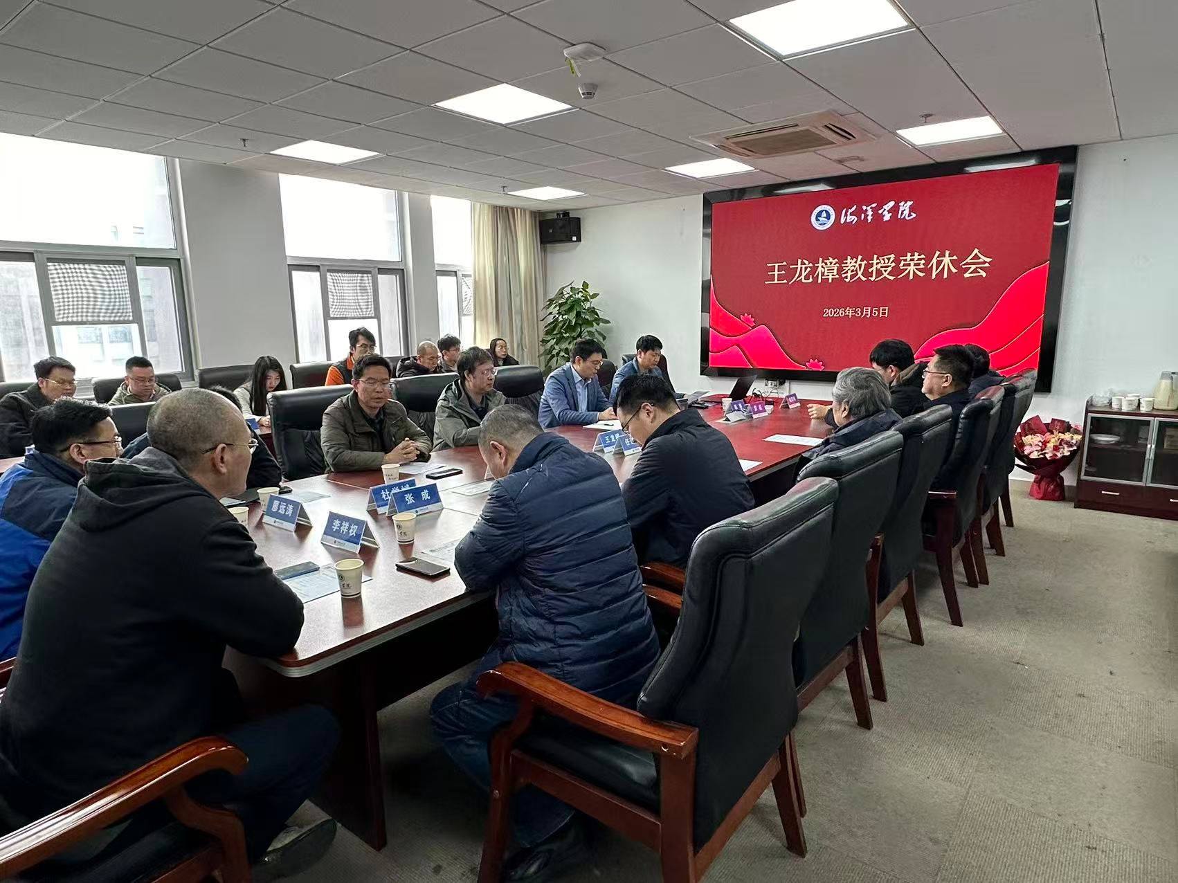 在校院领导、部分师生代表在A1804会议室向荣休的王龙樟教授致以最诚挚的敬意与祝福。本次荣休会由学院党委书记刘国华主持。
