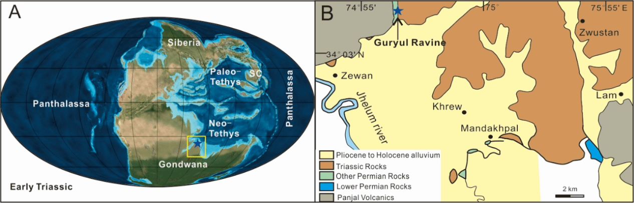 图1. 克什米尔地区Guryul Ravine古地理及研究区位置图( (//deeptimemaps.com)