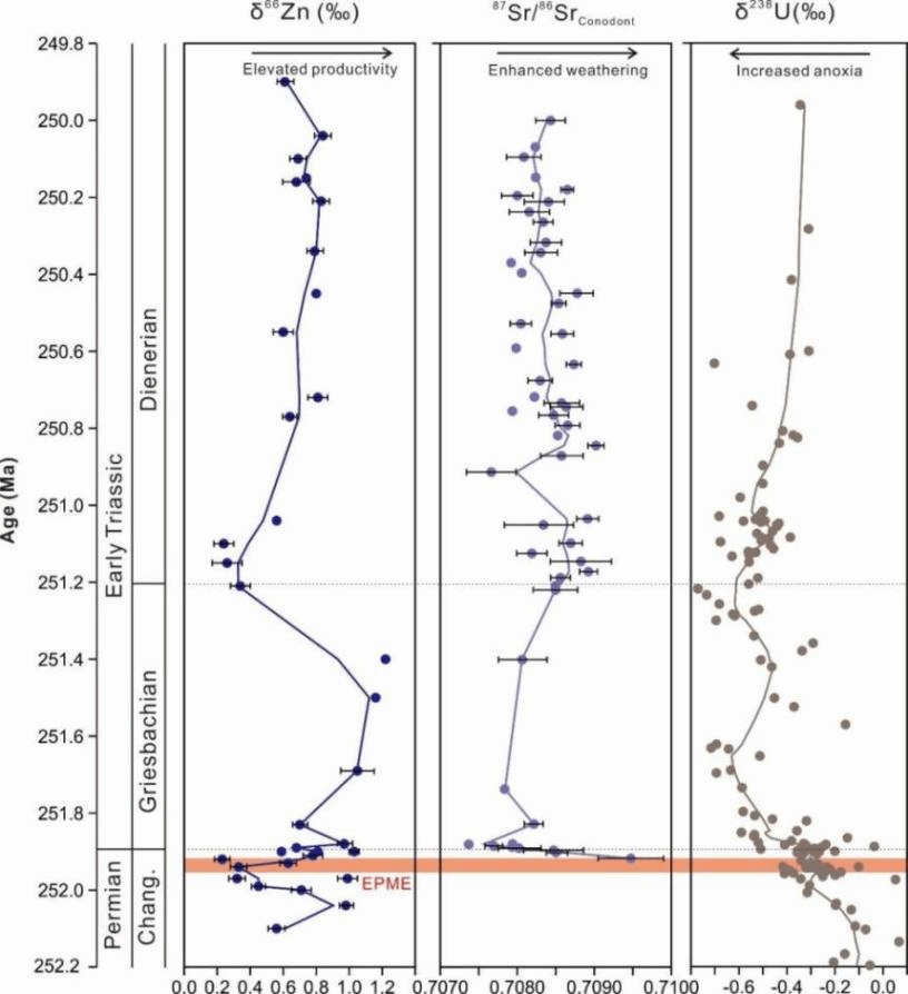 He Zhao, Thomas J. Algeo, Xiangdong Wang, Zhengyi Lyu, Xueqian Feng, Xinyang Yao, Zhenfeng Luo, Zhaochu Hu., 2026. Using carbonate Zn and conodont Sr isotopes to link marine productivity and chemical weathering intensity changes during the Permian-Triassic transition. Geochimica et Cosmochimica Acta. //doi.org/10.1016/j.gca.2026.03.027.