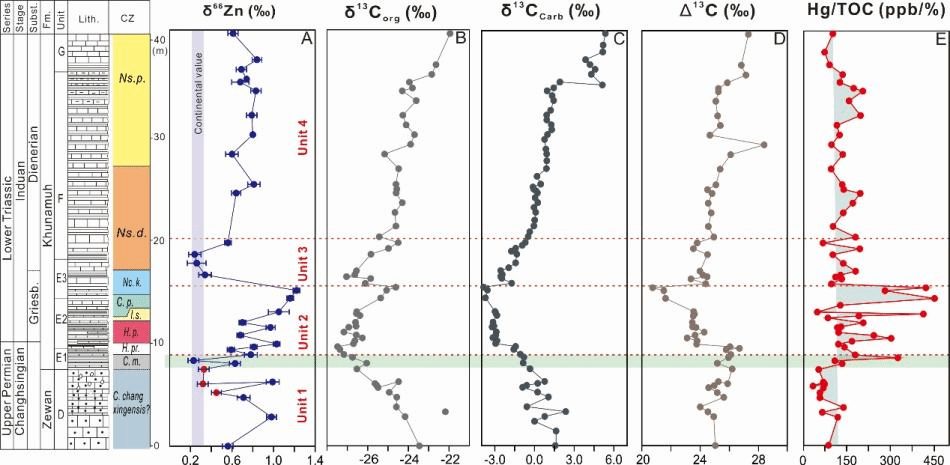 图2. 克什米尔地区Guryul Ravine剖面 (A) δ66Zncarb, (B) δ13Corg, and (C) δ13Ccarb, (D) Δ13C, (Ε) Ηg/TOC.