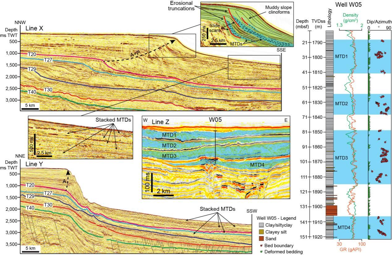 图2. (左图)地震剖面,展示了穿过1区(X测线)加积-进积地层样式以及4区(Y测线)加积(A)地层样式。Z测线穿过W05井,井上蓝色部分为解释的块体搬运沉积(MTD)。TWT—双程旅行时。(右图)W05井的地层柱状、密度测井曲线以及地层倾角图。蓝色区域表示MTD;mbsf—海底以下米数;TVDss—海底以下真垂直深度。