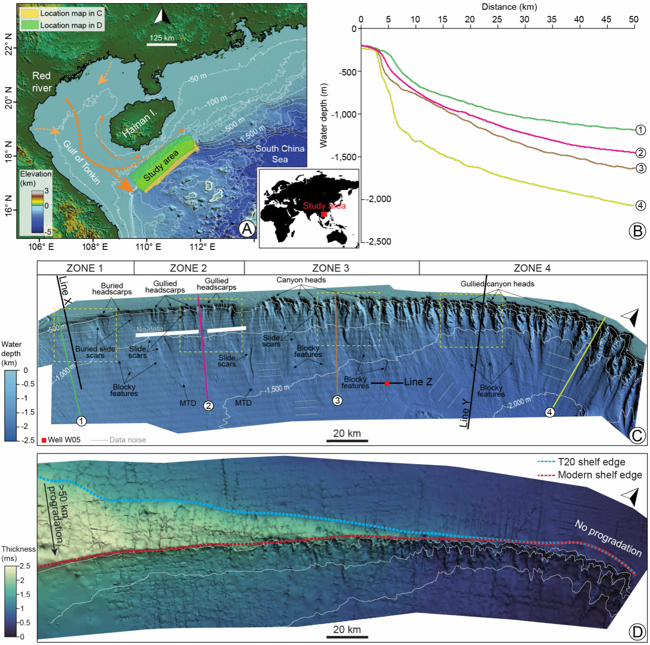 图1.(A)南海北部区域图以及表层输运方向。(B)位于图C的水深剖面图(彩色线条1–4)。(C)海底水深图,显示主要沉积/侵蚀地貌特征。(D)海底至T20层位地层厚度平面图。
