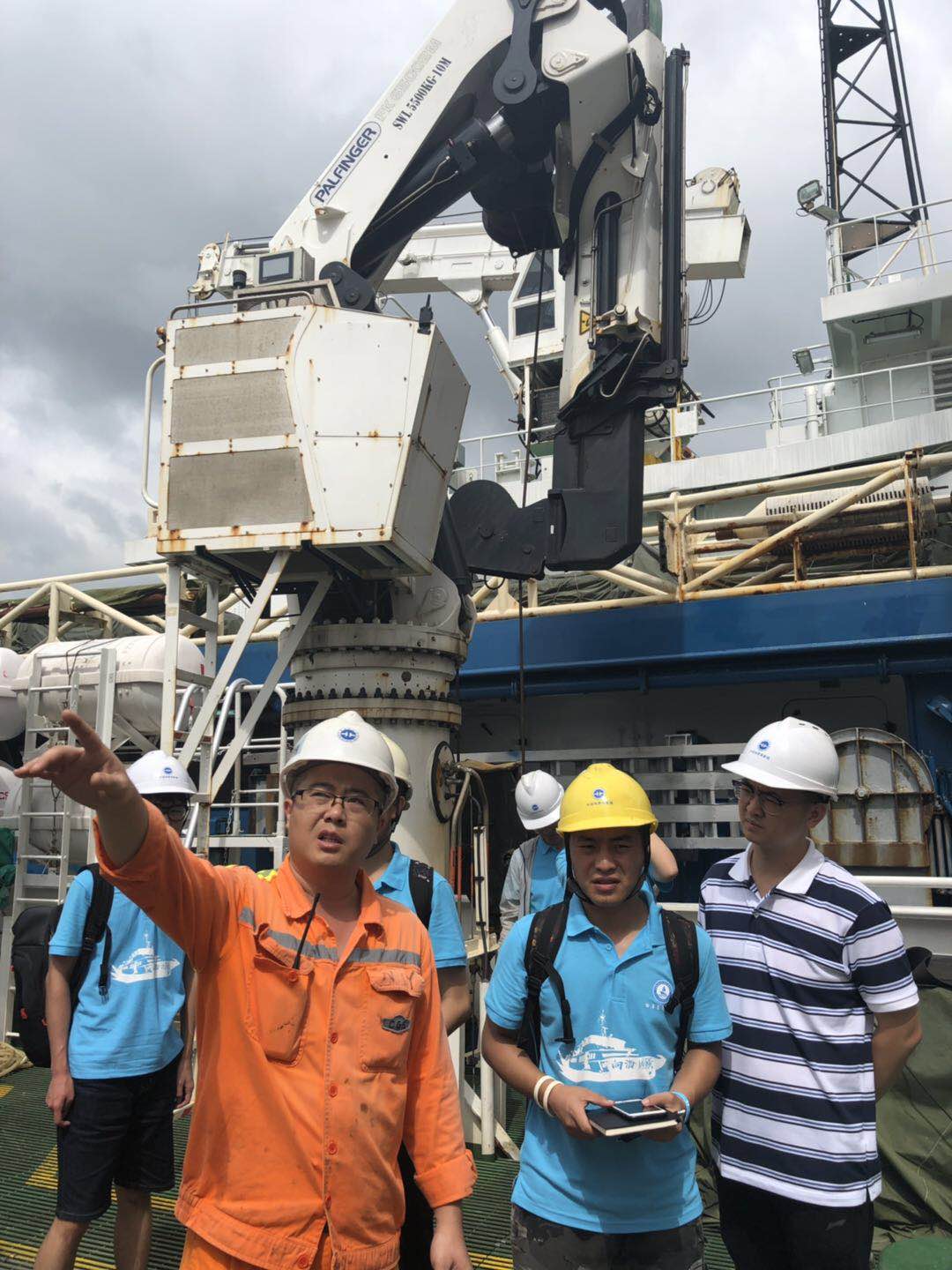 在殷机长和胡船长的带领下,队员们第一次登上科考船,第一次见船载钻探系统,第一次进入科考船的轮机室,第一次在船上餐厅吃饭……实践团队员们体验了海洋人真实的一天生活。在与殷机长的座谈中,队员们了解到,1984年我国拥有的第一艘地质调查船——探宝号,是一艘在美国已经服役15年淘汰的科考船,载重1200吨,可是在当时,探宝号已经是国内最先进的科考船。30多年来,我国海洋事业不断发展,我国如今已经自主研发设计了可集海洋地质,地球物理,物理海洋,海洋生物,海底钻探,水文调查等多手段综合调查,先进的深海浅层钻探系统以及可视化取样等设备,形成底层水体,海底表面,以及海底浅层的立体综合探测体系。从进口发达国家废弃旧船,到自主研发的海洋十号,再到即将建成的为建党100周年献礼的近4万吨水合物开采船,队员们看到了几代海洋人为我国海洋事业做出的巨大贡献,看到了改革开放以来我国的海洋建设事业迅速的发展和进步。