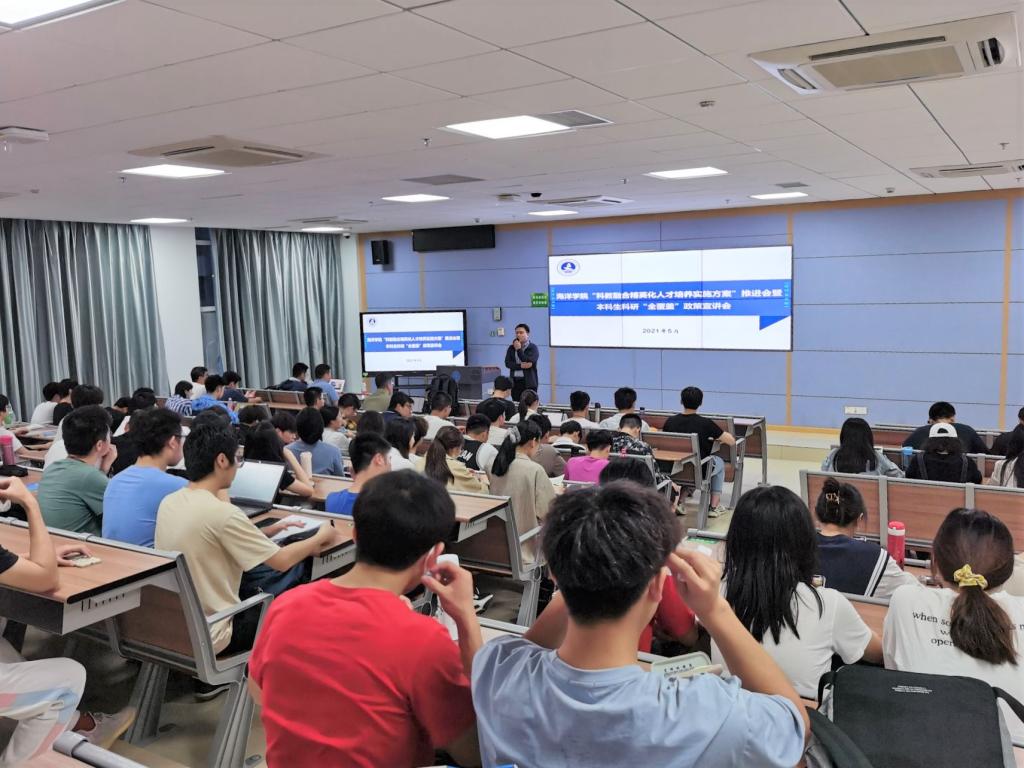 姜涛强调“科教融合精英化人才培养方案”的初衷与背景是让学院学科优势转化为人才培养优势,以培养和提高同学们的科研、创新、实践能力为主要目的。同学们要清晰的认识到打造研究生预科班是海洋强国人才需求的客观要求。方案正式实施后,学院进入专业学习阶段的同学,将在专业老师的指导下全员参与各类科研项目,在真正的科研实践中培养自身的科研兴趣和实践能力。
