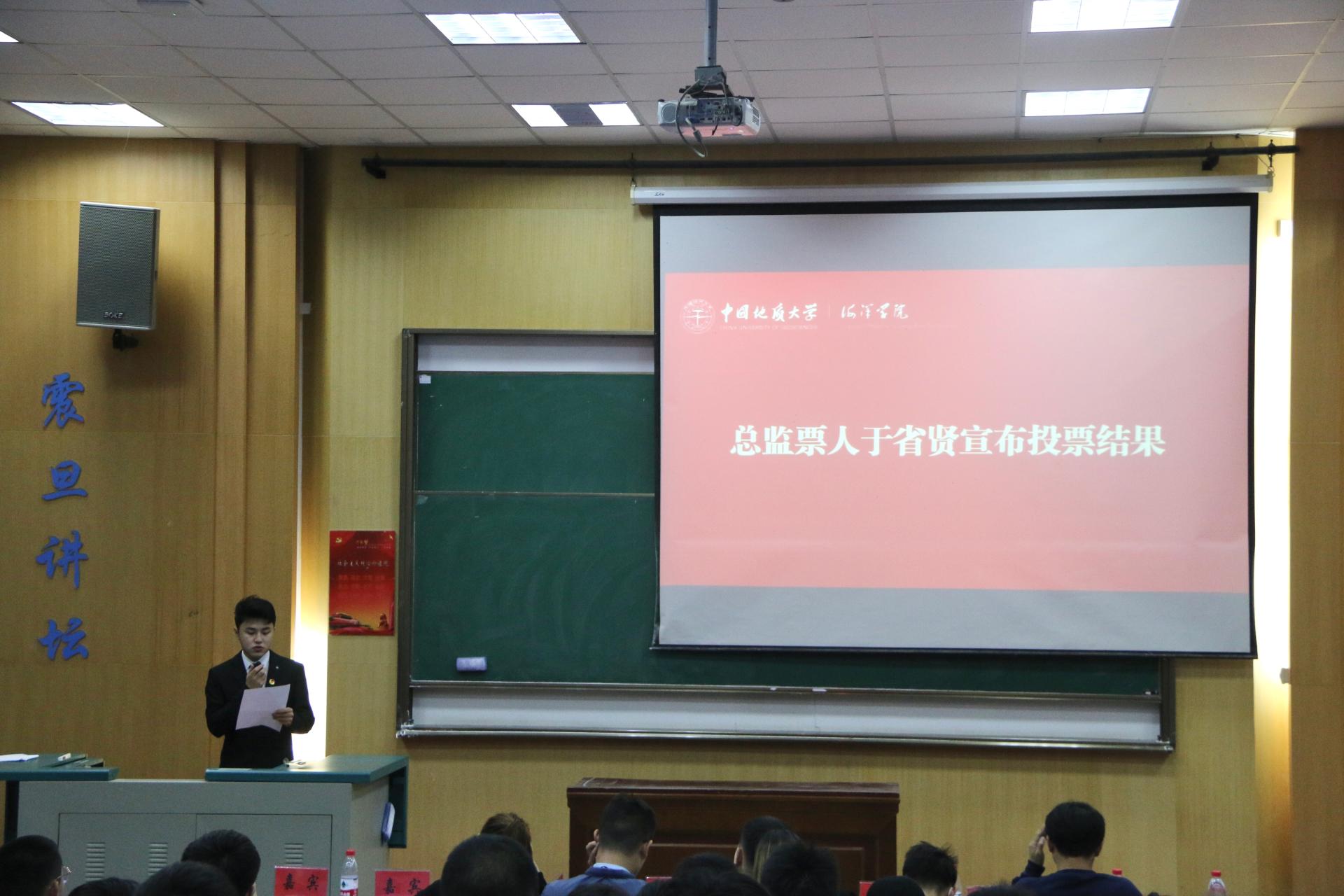 与会学生代表填写选票并投票。全体与会人员投票选举出Av影片 第五届学生委员会常务委员10名,以及Av影片 学生会主席团成员5名,团委副书记1名。由总监票人于省贤向全体与会代表公布选票的计票情况。