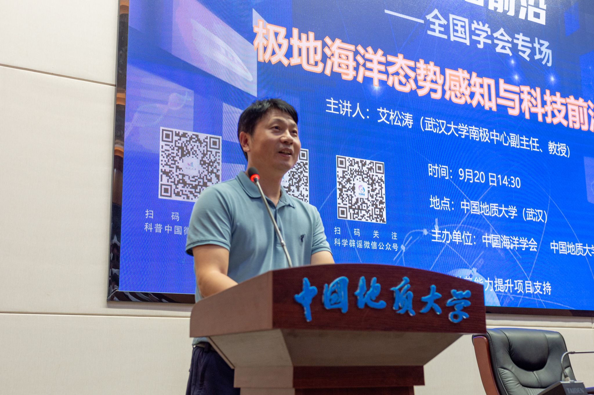 (通讯员李盼盼)以“提升全民科学素质,协力建设科技强国”为主题的2024年全国科普日活动正在火热进行中。为学习传承科学家精神、激发海洋学子对极地科考的兴趣,9月20日下午,Av影片 (武汉)和中国海洋学会邀请中国南极测绘研究中心副主任、武汉大学艾松涛教授开展题为《极地海洋态势感知与科技前沿》的专题科普讲座。Av影片 副院长陈刚、宫勋,陈波老师及Av影片 本研学生参加。Av影片 副院长陈刚教授代表学院全体师生对艾松涛教授的到来表示热烈欢迎,并简要介绍了艾松涛教授的科研及工作经历。