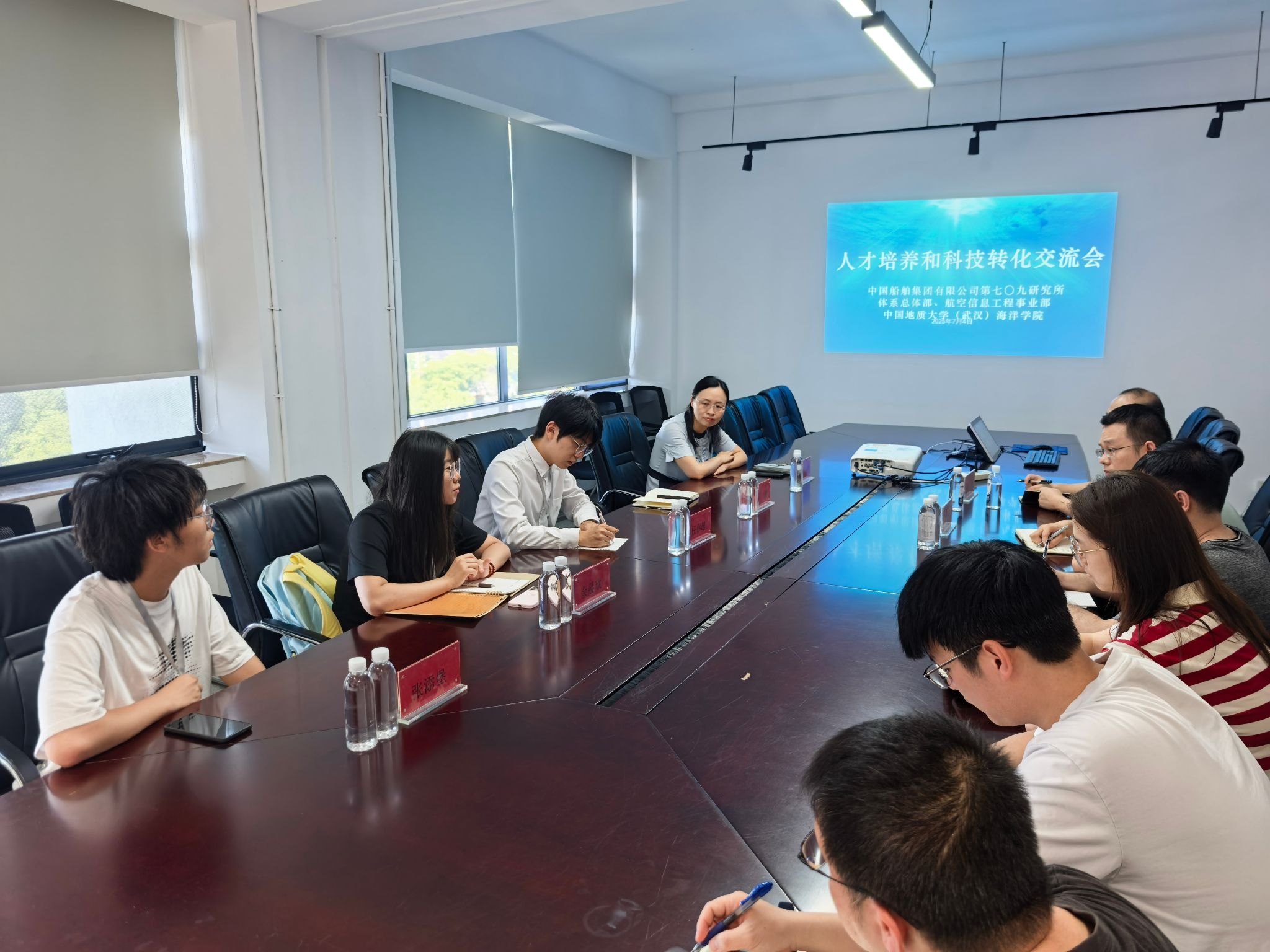为促进校企合作,助力学院人才培养与科技成果转化,近日,Av影片 党委副书记钟苹一行前往中国船舶集团有限公司第七〇九研究所访企拓岗。七〇九研究所相关部门负责人李立夏、周自立等参与座谈交流。团委书记陈波和部分学生代表随行。