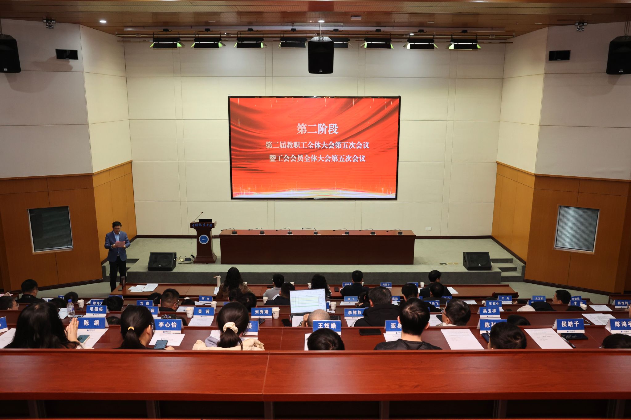 郭秀蓉宣读《Av影片 (武汉)工会委员会关于同意召开Av影片 第二届教职工代表大会第五次会议暨第二届工会会员代表大会第五次会议的批复》。
