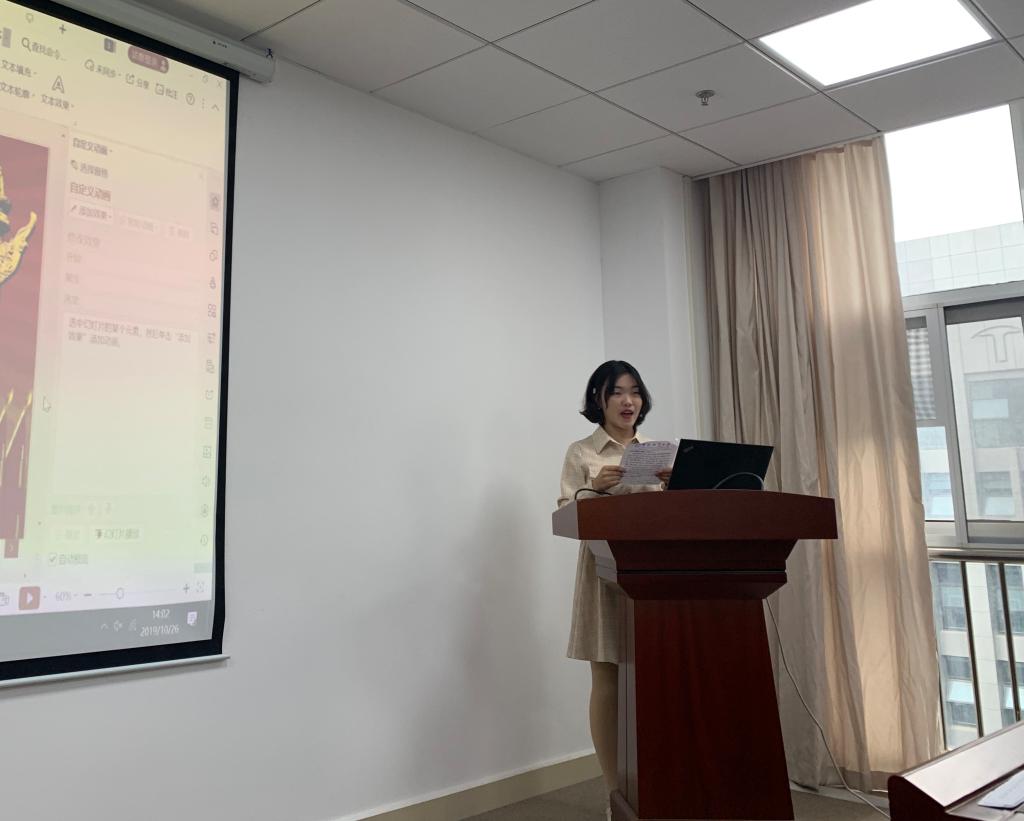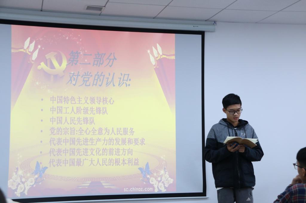 王鹏展同学通过ppt展示,阐述了他对党的理解与认识,他认为,入党是一件光荣的事情,但是党员要做的事情不是享受荣耀,更要肯吃苦耐劳,他将严格要求自己,积极参与党的建设。