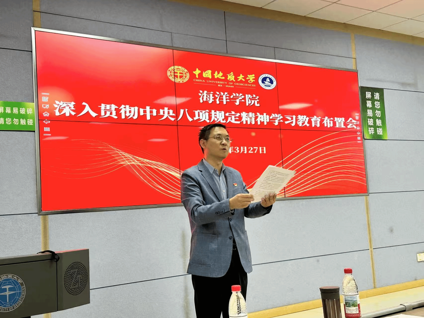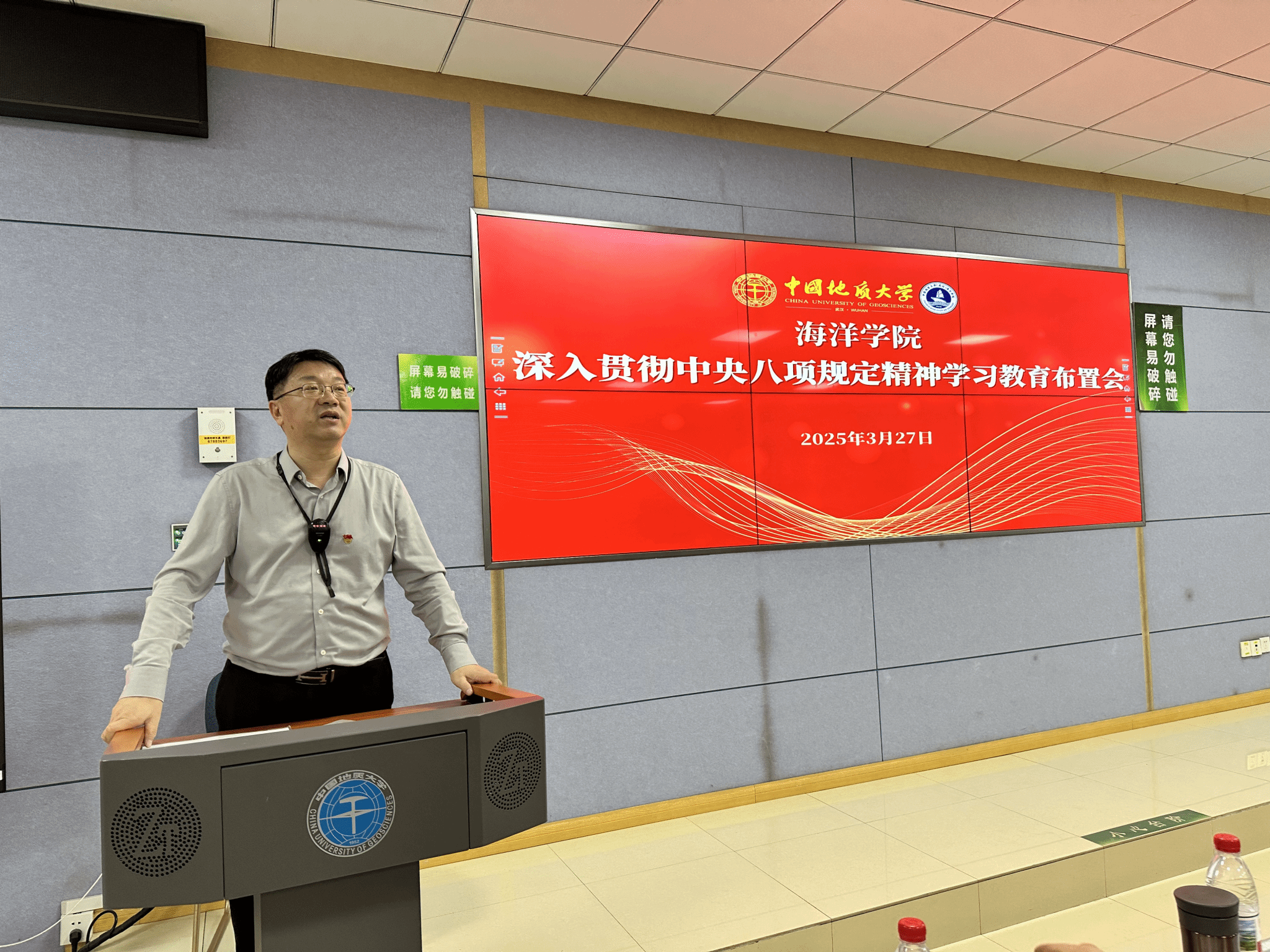 党委书记刘国华学院学习教育做动员部署。一是提高政治站位,深刻认识深入贯彻中央八项规定精神学习教育的重大意义。要引导广大党员干部进一步增强纪律意识、规矩意识,始终保持党的先进性和纯洁性;要切实解决师生反映强烈的突出问题,不断提高师生的获得感、幸福感和安全感。二是聚焦关键环节,推动走深走实。要深入贯彻中央八项规定精神学习教育,引导党员干部学深悟透,入脑入心;要全面深入查摆存在的问题找准问题症结建立问题清单;要长期坚持抓好整改落实制定切实可行的整改措施明确整改责任和时限建立健全长效机制,做到经常抓、见常态,深入抓、见实招,持久抓、见长效。三是强化责任担当,确保有序推进。要压实工作责任,学院成立了领导小组,学院党委切实担负起主体责任班子成员落实好“一岗双责”、党支部书记履行好岗位职责,确保学习教育全覆盖;要加强督促检查,成立专门督查组,对走过场、搞形式的严肃问责;要营造良好氛围,充分利用学院官网、海洋HiYoung微信公众号、宣传栏等宣传阵地广泛宣传,加强舆论引导。学院将通过此次深入贯彻中央八项规定精神学习教育,以更严的要求、更实的举措、更优的成效,真正让规矩立起来、作风严起来、效率提起来,为培养出更多符合新时代发展需要的海洋人才交出合格答卷。