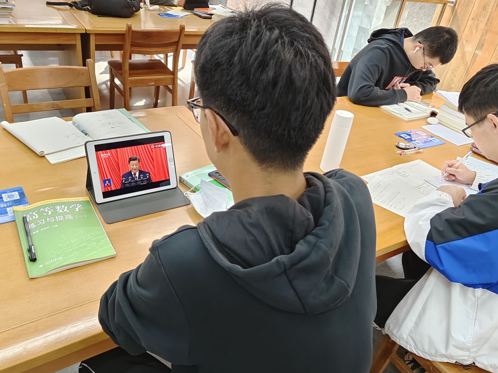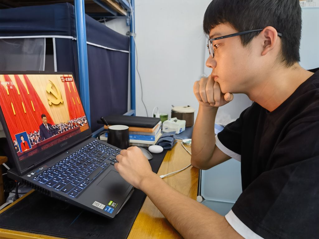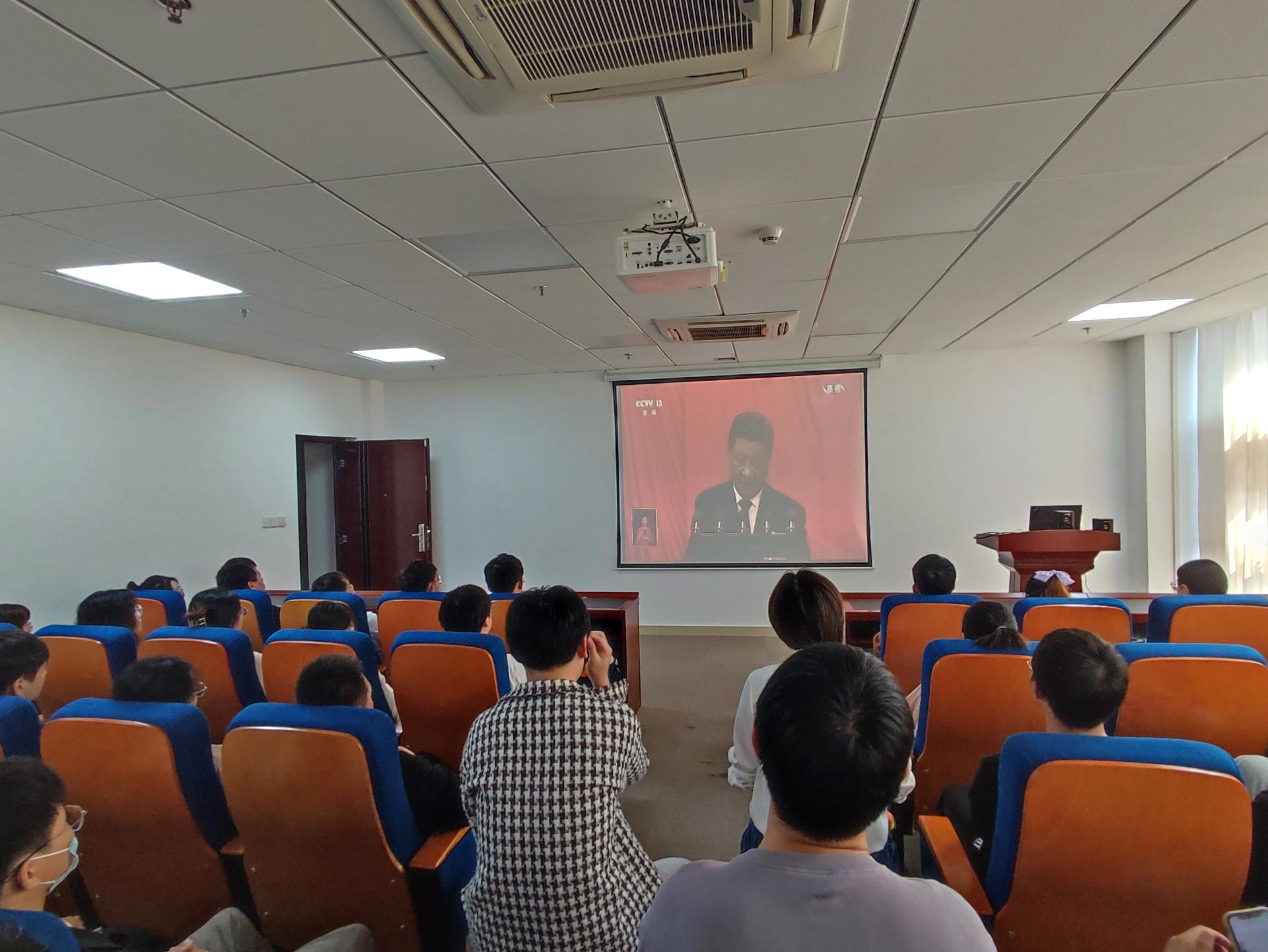 学院党委书记成军,院长孙军,学院党委副书记钟苹,副院长姜涛、陈刚、孙启良,系教师代表雷超、董友扣和部分学生代表在东教A1804会议室集中观看;学院各教师、学生党支部代表,学生团支部代表分别在东教A1805、A1816会议室集中观看。全体学生在教室、宿舍通过电脑观看。