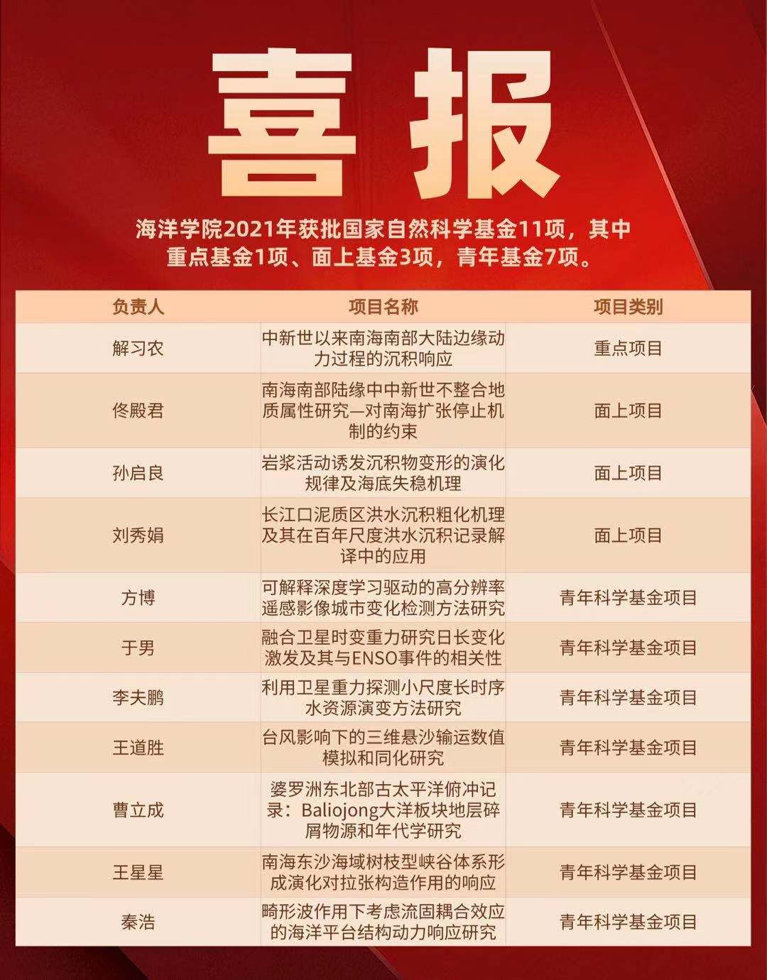 近日国家自然科学基金委员会公布了2021年度国家自然科学基金申请项目评审结果。Av影片 共获批国家自然科学基金11项,其中重点基金1项、面上基金3项,青年基金7项。在此,特向获得资助的项目负责人表示祝贺!