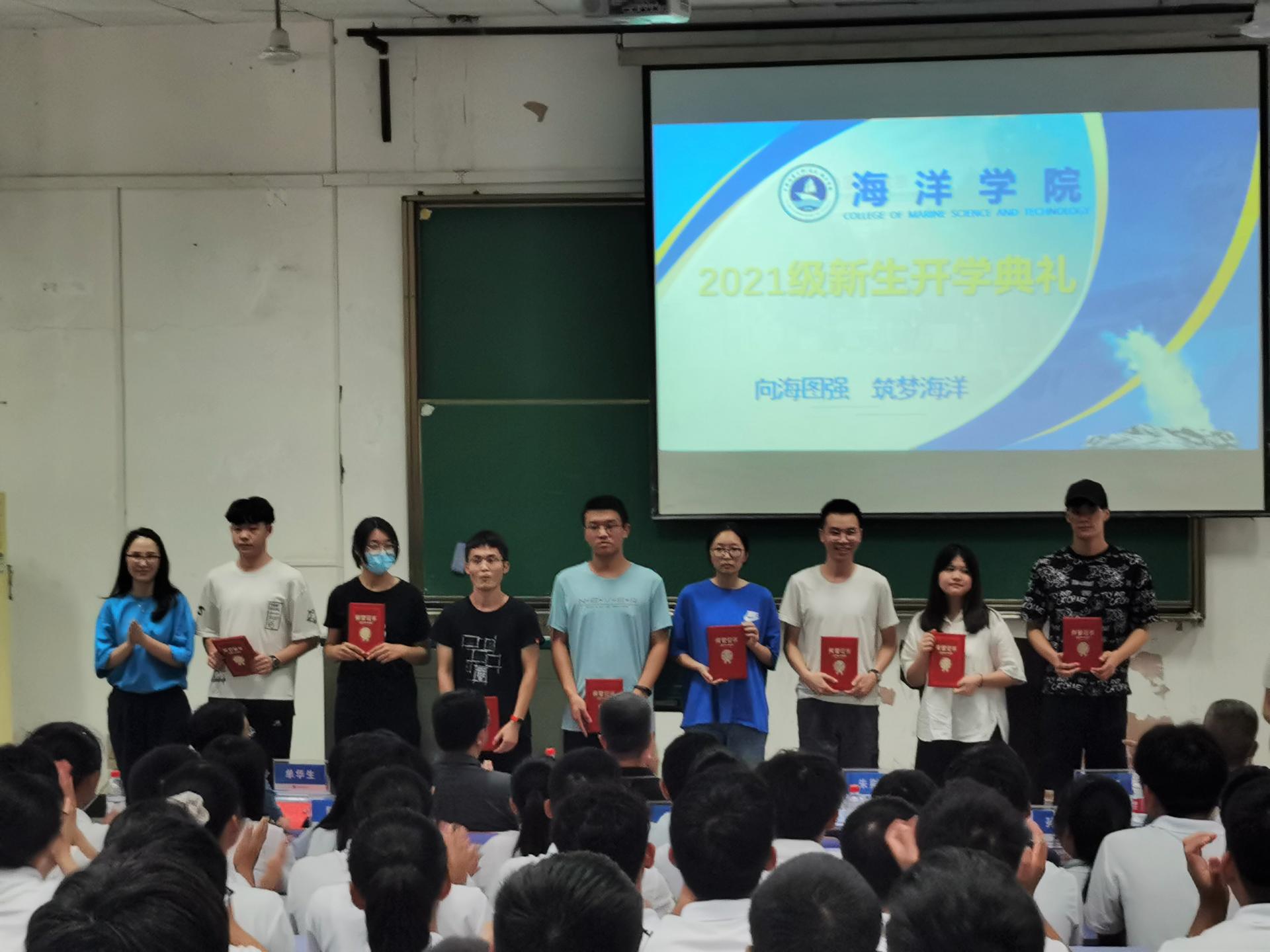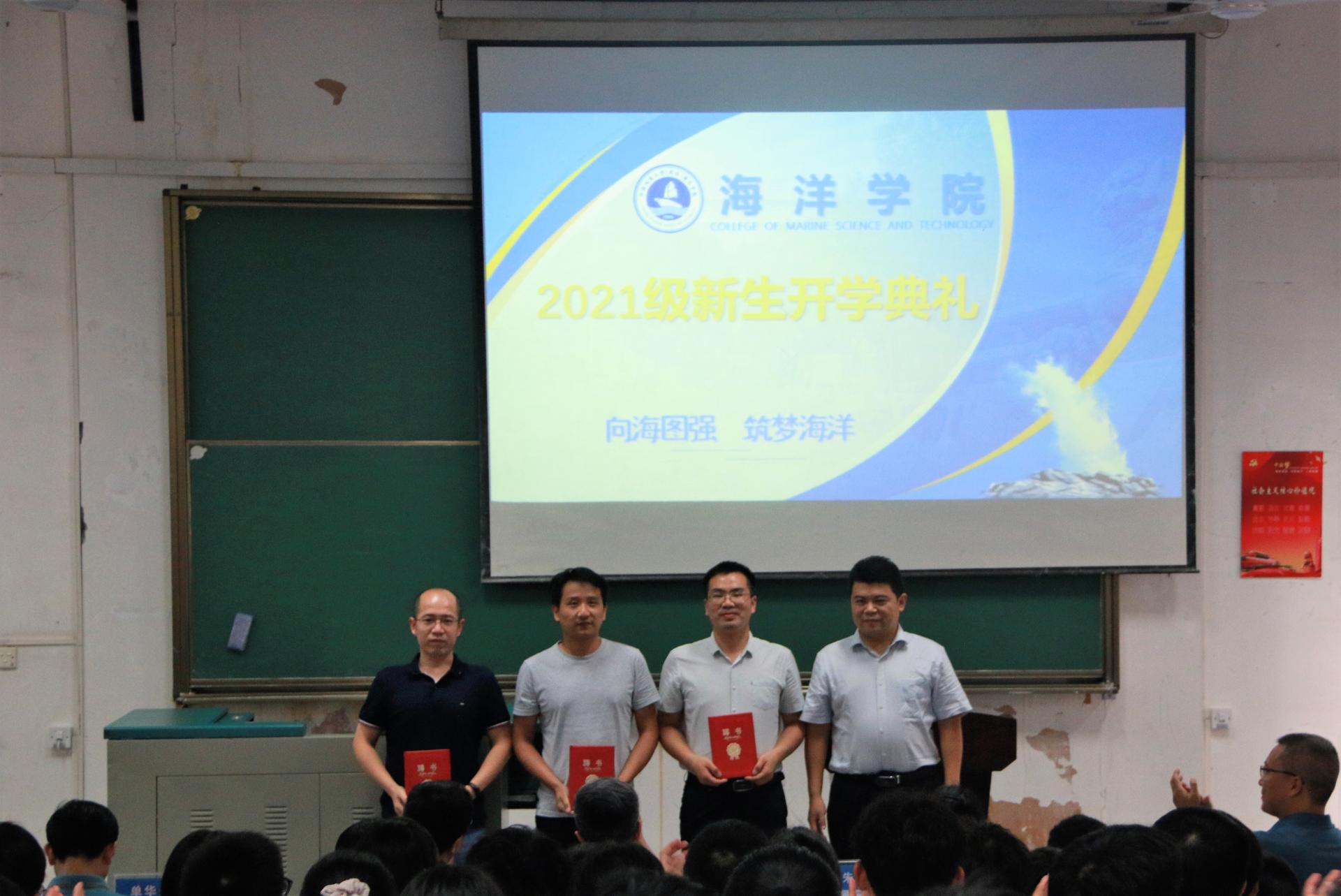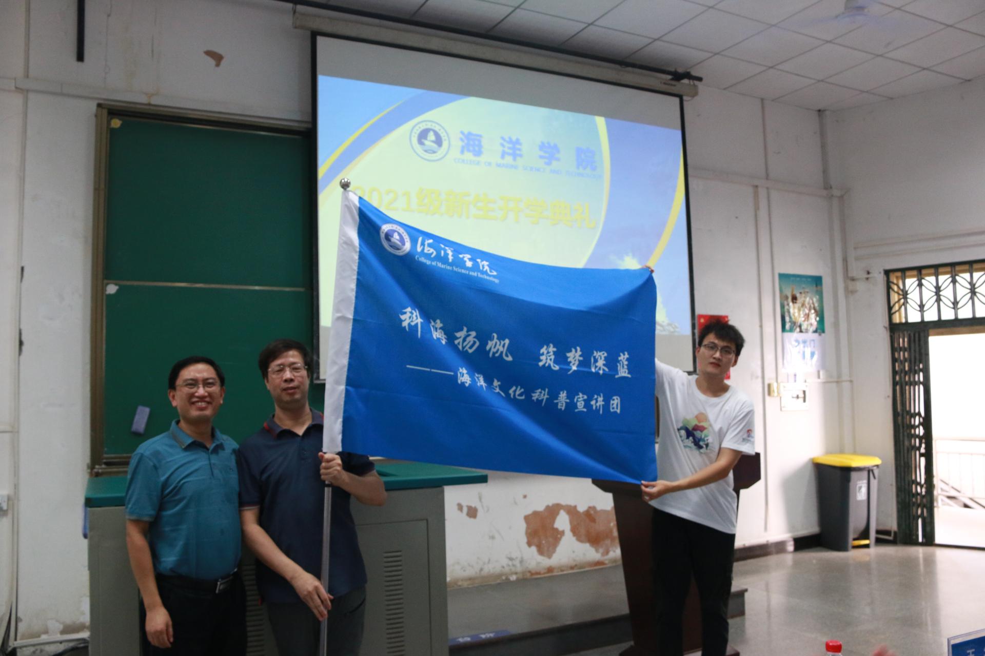开学典礼表彰仪式上,由校团委书记朱荆萨为海洋文化节优秀营员颁发证书,科发院副院长单华生为“科海扬帆,筑梦深蓝”海洋科普宣讲团授旗,Av影片 副院长姜涛为2021级班主任颁发聘书。