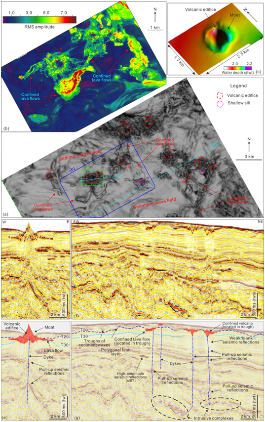 图1:火山及熔岩流特征及岩浆运移通道。A:火山及熔岩流底界面的方差体特征。熔岩流主要分布在沉积物波(Sediment waves)的凹槽内(Confined lava flows)。V1-V13为研究区内的火山;B:火山及熔岩流底界面上下30毫米均方根振奋。熔岩流主要表现为强振幅根振奋(暖色),火山(冷色)为熔岩流所包围;C:研究区编号9火山(V9)的三维特征。该火山表现为锥形,并且周围为底流形成的凹槽(Moats)所环绕;D和E:穿过火山9的地震剖面及其解释。在火山体之下可以清晰的观察到“上拉”的地震反射特征。岩墙可能存在其中;F和G:地震剖面及其解释。可以清楚的观察到熔岩流赋存在沉积物波的凹槽之中,以及火山体或熔岩流之下的岩墙和正断层。