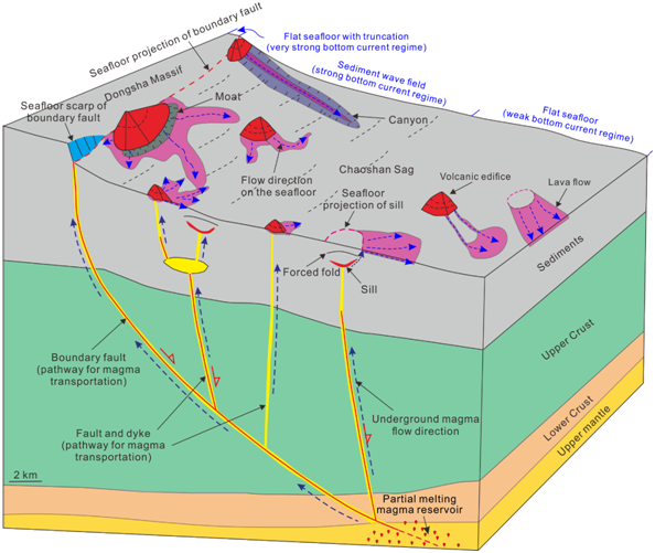 图2:南海北部裂后岩浆的形成、运移和喷发模式。部分熔融的物质首先沿拆离断层向上运移,喷发出海底或者侵入上地壳/沉积层。在浅部岩浆的运移主要通过岩墙和正断层。喷发物质在海底主要受控于底流及重力流所塑造地貌