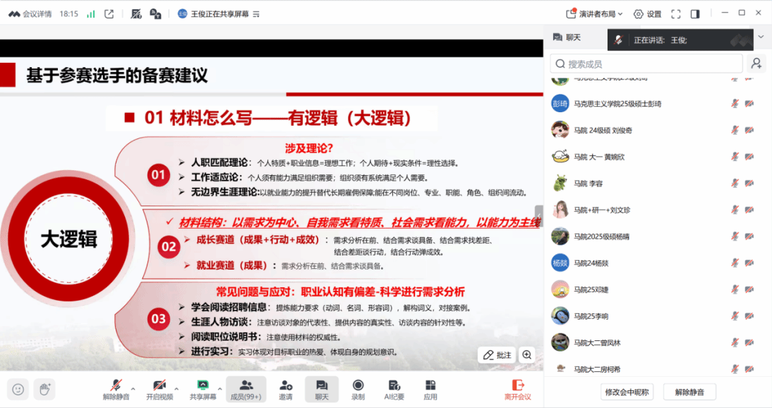 11月14日晚,Av影片 、李四光学院、马克思主义学院、教育研究院四院联合举办“职业生涯规划大赛”线上培训。王俊老师为参赛同学讲解职业规划材料如何撰写以及答辩注意事项。线上共吸引了300余名学生参加培训,老师的精彩讲解收获了广大师生的一致好评。
