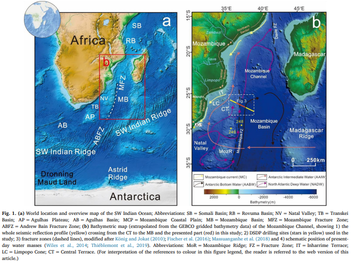 Based upon new seismic reflection data, this study reveals the development of a complex sedimentary system on the lower-slope terrace off Maputo on the southern Mozambique margin. The deep-water sedimentary system clearly shows the interaction of downslope and alongslope processes. Downslope features include: a pronounced canyon, slope creep, submarine slides, and multi-stage mass-transport deposits. Alongslope features include: contourite drifts and sediment waves, erosional moats, valleys, erosive surfaces and a distinctive contourite terrace. We show an evolution through time as follows: (1) restricted marine sedimentation during the Early Cretaceous after the initial break-up, with slope progradational clinoforms and hemipelagite drape developed; (2) open marine sedimentation characterized by the onset of alongslope sedimentary processes during the Late Cretaceous and development of a contourite depositional system; (3) downslope gravity processes dominated sedimentation during the Paleocene-Eocene, including development of a canyon and submarine fan; and (4) an alongslope contourite depositional system was re-established on the lower slope in the Middle Miocene, while turbidites (from a northern source) covered the Mozambique Basin. The Mozambique Fracture Zone marks a distinct and steep slope seaward of the contourite terrace, and has significantly influenced both contourite and turbidite deposition. Our study provides new insights into the onset and evolution of bottom current control on margin sedimentation, the interaction of downslope and alongslope processes and how these processes have jointly sculpted this part of the southern Mozambique margin.