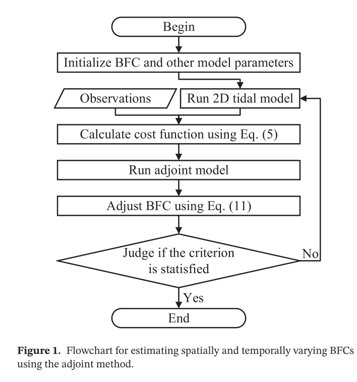 底摩擦系数是精确模拟水动力环境和悬沙输运的关键,对科学研究和沿海海洋工程具有重要意义。众多现场观测表明,底摩擦系数是时空变化的,但在传统潮汐模型中很难精准给定时空变化的底摩擦系数。本研究基于一个二维多分潮潮汐伴随同化模型,同化TOPEX/Poseidon卫星高度计所得渤黄东海M2S2K1O1四个主要分潮的调和常数数据,优化估计了该海域时空变化的底摩擦系数。利用独立的验潮站观测数据对模型性能进行了评估,结果表明:同化后各分潮模拟精度显著提高。一系列敏感性实验结果表明:时间平均后的底摩擦系数空间分布特征是稳健的,不受模型设置的影响;空间平均后的底摩擦系数时间变化特征也是稳健的,但与分潮的选择有关。此外,优化反演所得时空变化底摩擦系数随流速和水深的变化与该海域观测趋势一致。总体而言,优化反演所得时空变化底摩擦系数与流速、水深密切相关,这归因于不同流速环境下海床泥沙的侵蚀沉积过程和海底粗糙度的变化。本研究为底摩擦效应参数化和多分潮潮汐模型中底摩擦系数的合理设置提供了一定的参考。