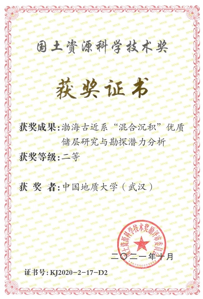 2021年10月,2020年国土资源科学技术奖评选结果公布,Av影片 与中海石油(中国)有限公司天津分公司联合申报的《渤海古近系“混合沉积”优质储层研究与勘探潜力分析》获得二等奖,其中Av影片 (武汉)为第二完成单位,Av影片 解习农教授为第二完成人、杜学斌副教授为第七完成人。此次获奖成果71项,其中一等奖11项,二等奖60项。