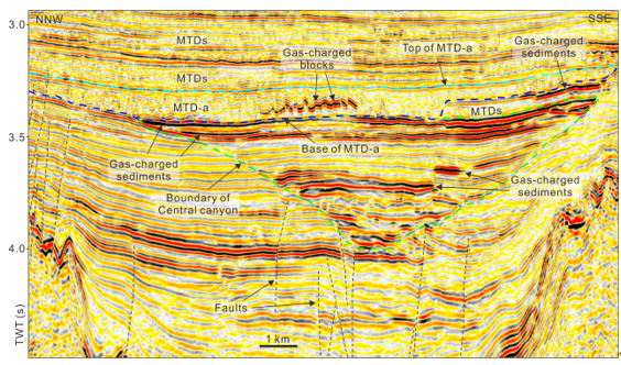图1:海底滑坡(MTD-a)、逆冲断层和充气断块(gas-charged blocks)地震反射特征