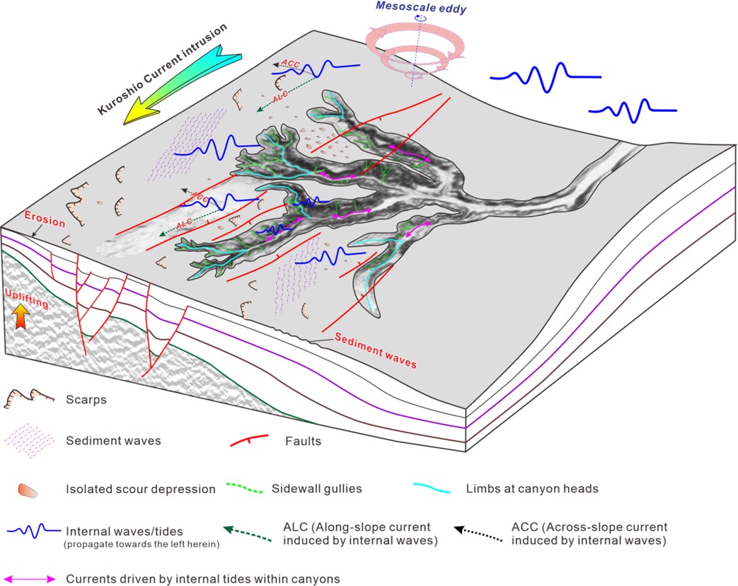 图2. 东沙陆坡构造和海洋过程对树枝型峡谷体系形成演化的控制模式