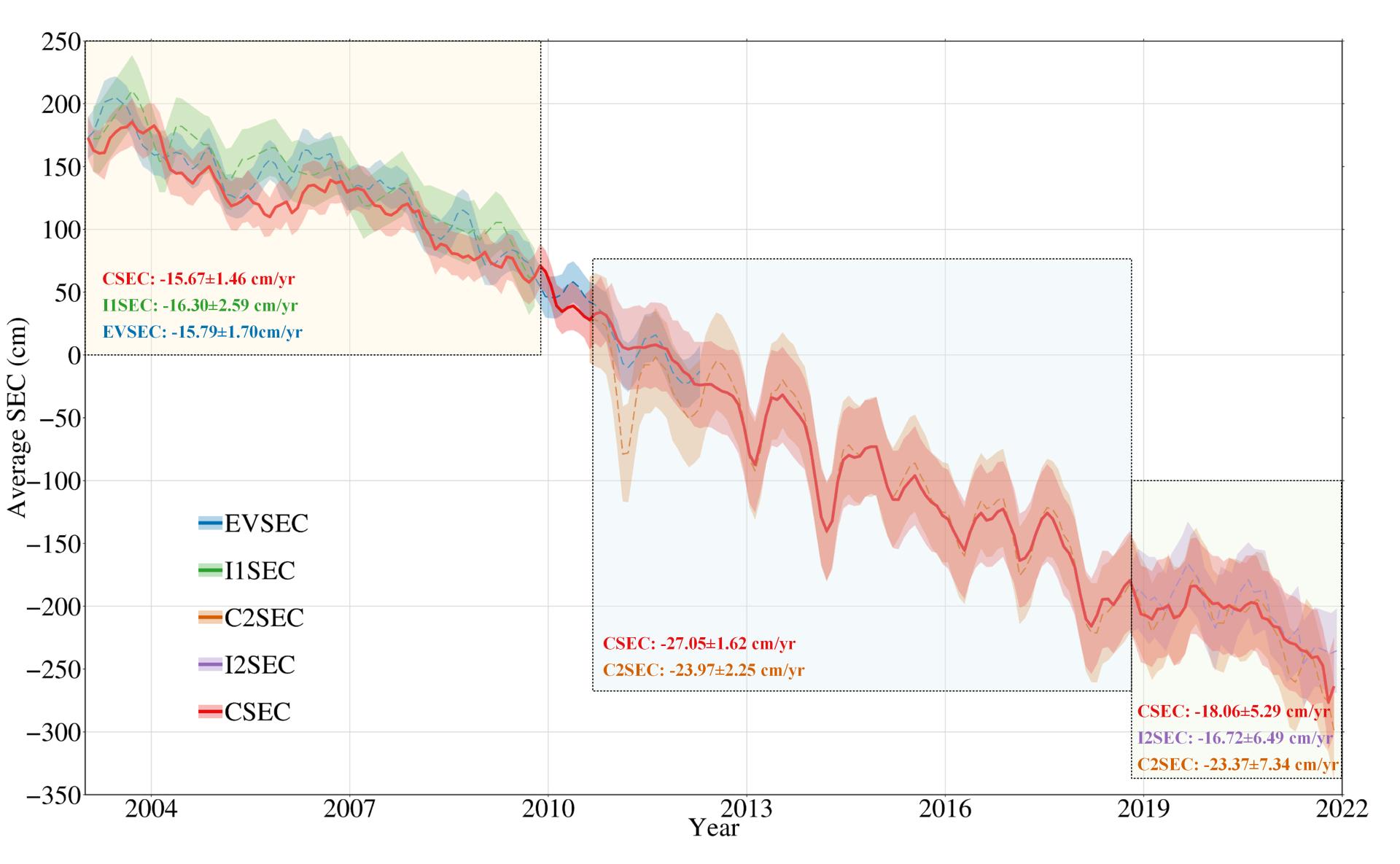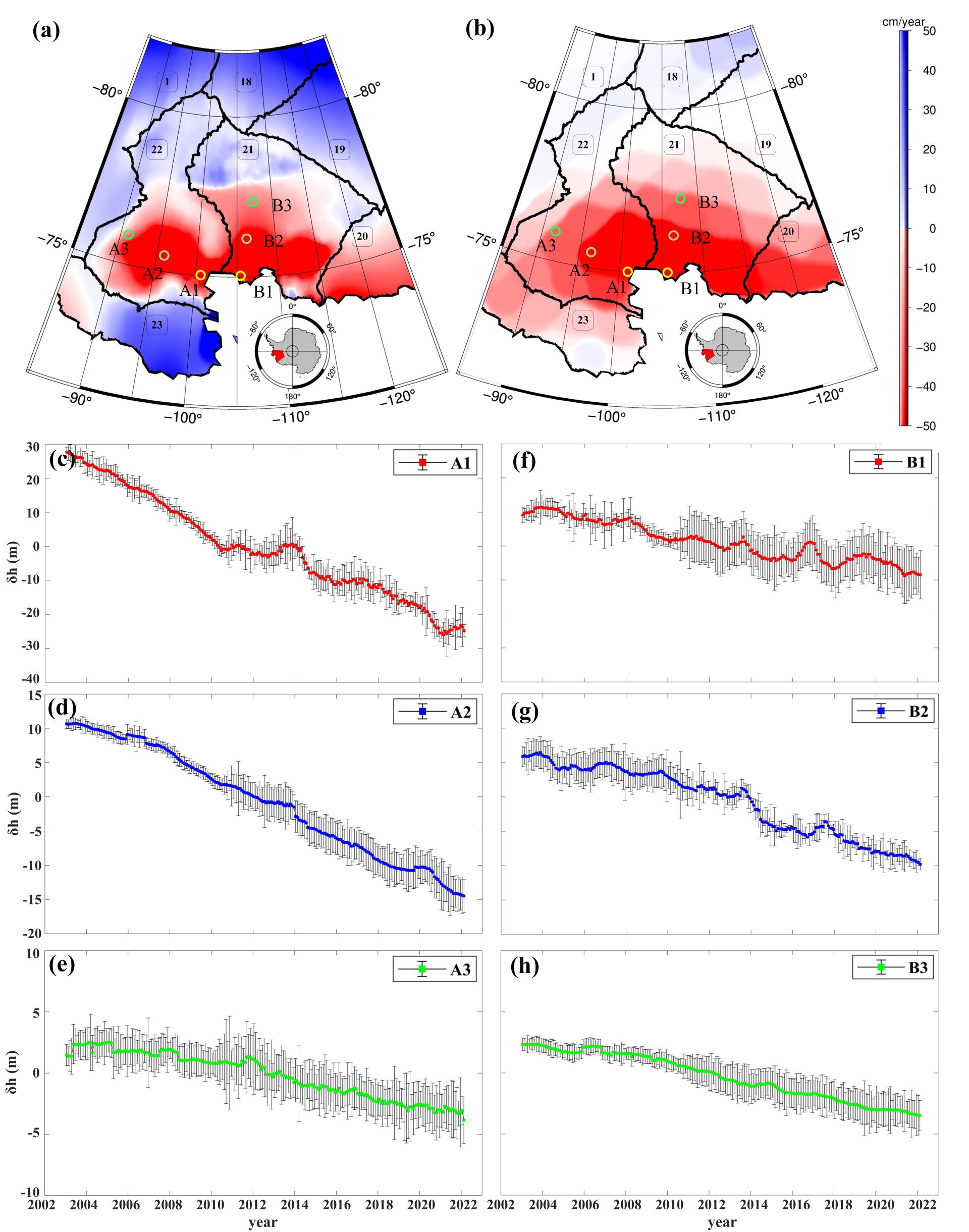 近日(2023年5月4日),国际地学著名期刊《Journal of Geophysical Research - Earth Surface》在线刊发了Av影片 陈刚教授团队题为“Reconstructing continuous ice sheet elevation changes in the Amundsen Sea Sector during 2003-2021 by merging Envisat, ICESat, CryoSat-2, and ICESat-2 multi-altimeter observations”的西南极洲阿蒙森海冰流域冰盖变化研究成果。上述研究由Av影片 博士生悦连哲(导师陈刚教授)第一作者,陈刚教授和超能芳副教授共同通讯作者等团队成员共同完成。