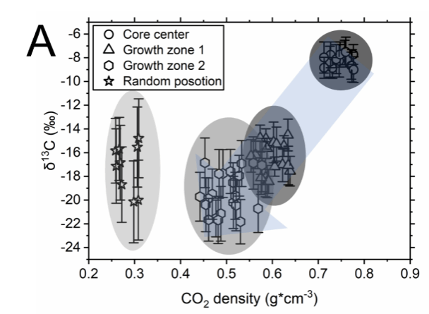 在板块俯冲相关的成岩、变质、岩浆、火山等地质过程中,含碳地质流体常被宿主矿物捕获并形成流体包裹体而得以保存,对含碳地质流体包裹体进行高精度分析是准确揭示含碳流体的多期活动演化规律的基础。项目发展了一系列单个含碳流体包裹体的PVTx准确测定方法、相较于前人对含水二氧化碳/甲烷体系在组分-密度以及流体古温压状态恢复方面的精度提高了数倍-数十倍。建立了准确测定单个包裹体流体组成与碳氧同位素高精度微区分析新方法,碳同位素测定精度可以达到1~2‰,氧同位素的精度可以达到2~5‰,首次实现具有微米级的空间分辨率、直接高精度同步测定单个二氧化碳流体包裹体碳氧同位素,从而能够准确揭示细小矿物和微细脉体中多期次流体活动演化记录、示踪含碳流体参与的成岩、成矿、变质、岩浆作用,揭示碳的跨圈层演化机制。