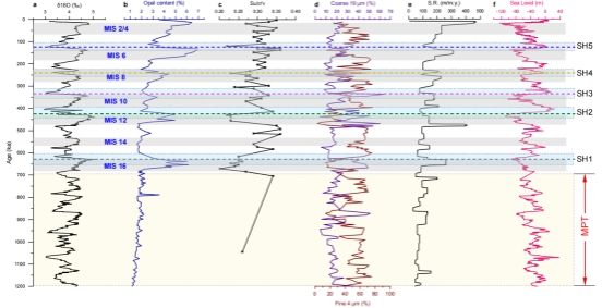 图2 ODP 1146钻孔沉积特征、力学强度(由抗剪强度与垂向有效应力比值(Su/σ’v)表征)及沉积背景随时间变化曲线。薄弱层SH1-SH5均形成于中更新世气候转型期后冰期最低海平面阶段。