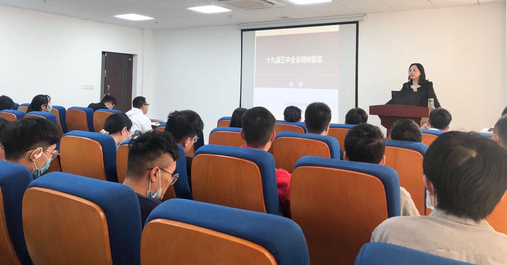 2020年11月13日下午,Av影片 党委副书记钟苹于东教A座1805会议室为学院学生党员上“十九届五中全会精神解读”专题党课。